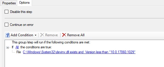 - On the Check if KB2952664 group’s Options tab, add a condition to check for the file version information. This will allow us to only apply the patch if the file isn’t current.