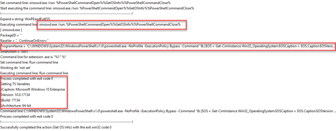 If we launch a Task Sequence and add a Debug command line (See below for steps to add Debug to as Task Sequence), we can run this manually and get this: