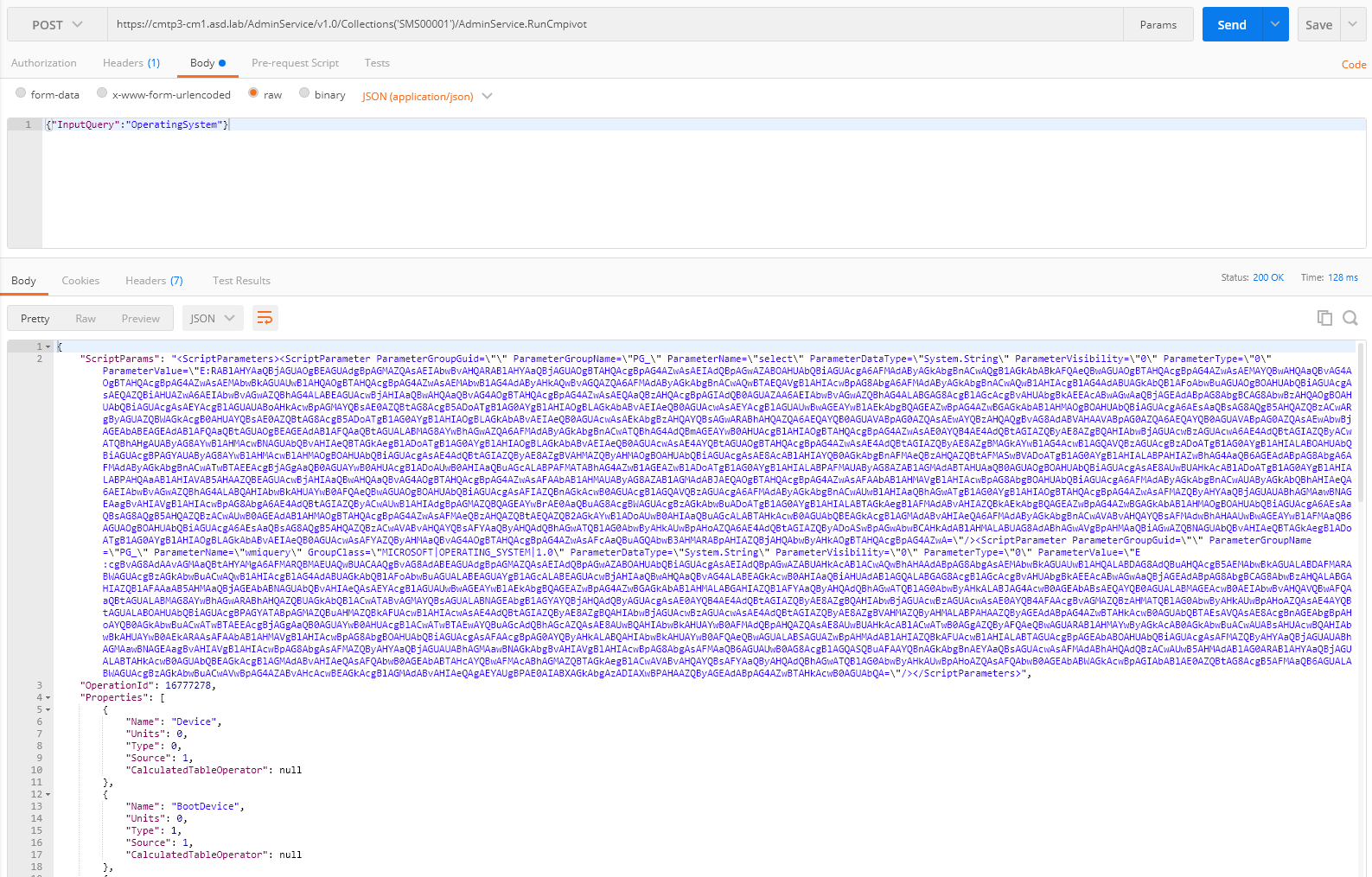 In order to run CMPivot, you need a CollectionId and a QueryString. Also, AdminService is CaSe SeNsEtIvE, so be careful! Run these commands in Postman to query. Don’t forget to change the request type to POST since you have to submit a request body.