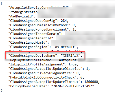 For no real reason, I decided to check if the machine was getting an Autopilot profile. The Event Viewer showed that the device had gotten an Autopilot json file, which seemed odd since this device shouldn’t have had a profile assigned yet. I opened C:\Windows\ServiceState\Autopilot and found AutopilotDDSZTDFile.json. In here, I found the smoking gun!